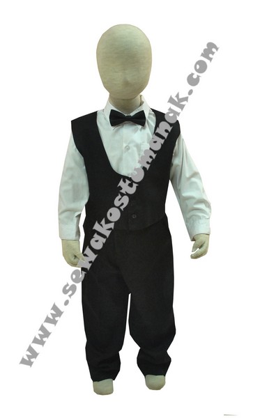 Baju terdiri dari: Kemeja, rompi, dasi kupu-kupu, celana